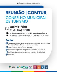 Reunião do Conselho Municipal de Turismo – COMTUR 🌍✨ 📅 Quinta-feira, 31 de julho 🗓️ Pauta: Venha participar e contribuir para o desenvolvimento turístico da cidade! 🎉🏞️