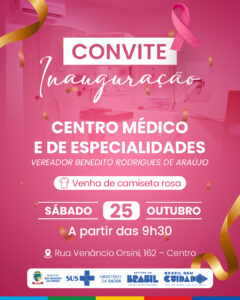 Grande Inauguração! O convite é para toda a comunidade! Vista sua camiseta rosa e venha apoiar a campanha do Outubro Rosa, promovendo a conscientização sobre o câncer de mama. 📍 Local: Rua Venâncio Orsini, 162 – Centro Juntos por uma cidade mais saudável e consciente! #RioGrandedaSerra #CentroMédico #SaúdeParaTodos #OutubroRosa #Prefeitura #SUS #BrasilBemCuidado #MinistérioDaSaúde #JuntosPelaSaúde