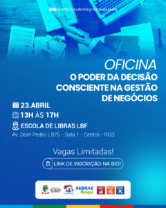 Participe da oficina “O Poder da Decisão Consciente na Gestão de Negócios” no dia 23 de abril, das 13h às 17h, na Escola de Libras LBF (Av. Dom Pedro I, 876 – Sala 1 – Centro – RGS). 📋 Vagas limitadas – inscreva-se pelo link! https://inscricao.sebraesp.com.br/produto/turma/38080682