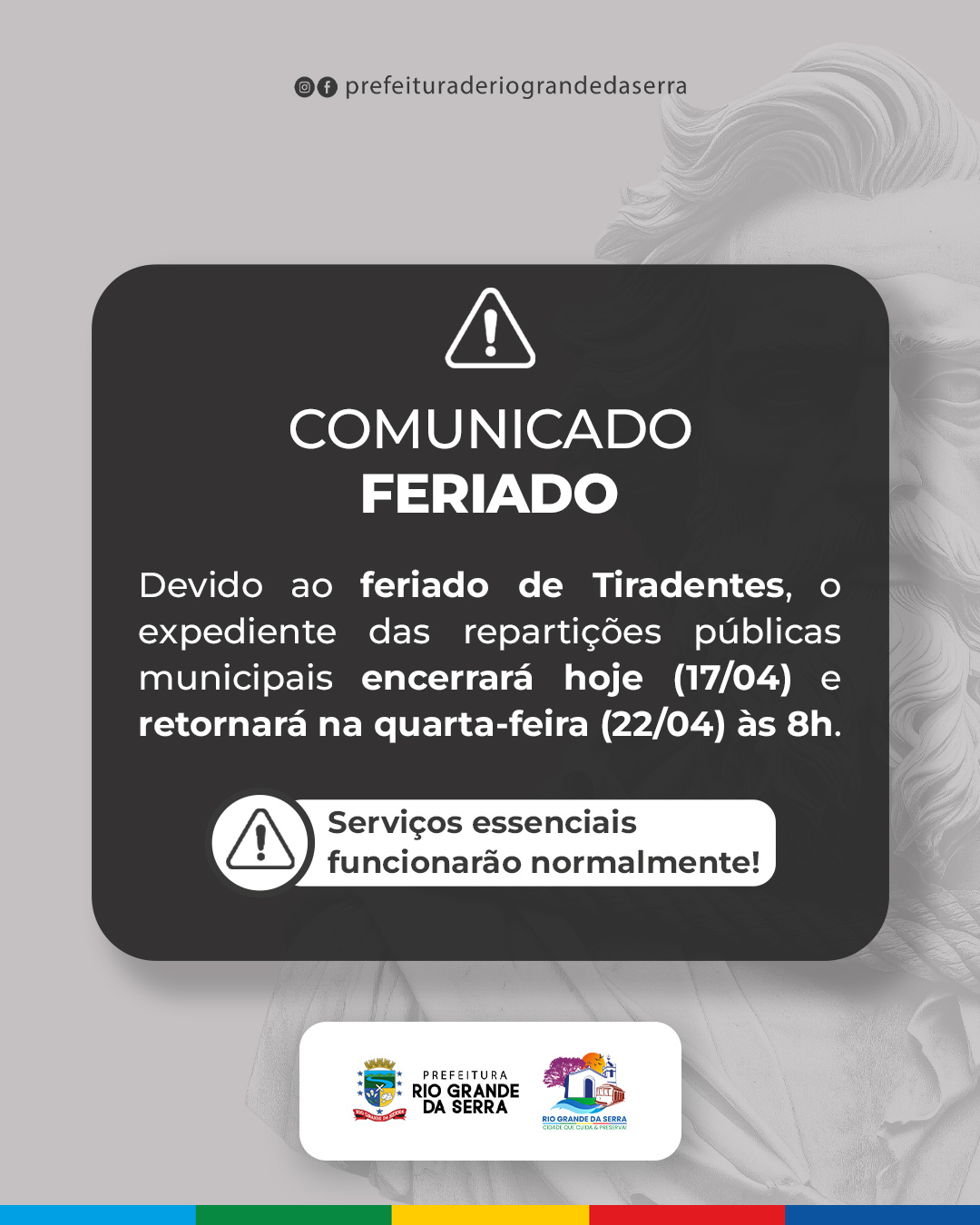 ⚠️ Atenção! Devido ao feriado de Tiradentes, o expediente das repartições públicas municipais encerra hoje (17/04) e retorna na quarta-feira (22/04) às 8h. Os serviços essenciais funcionarão normalmente.